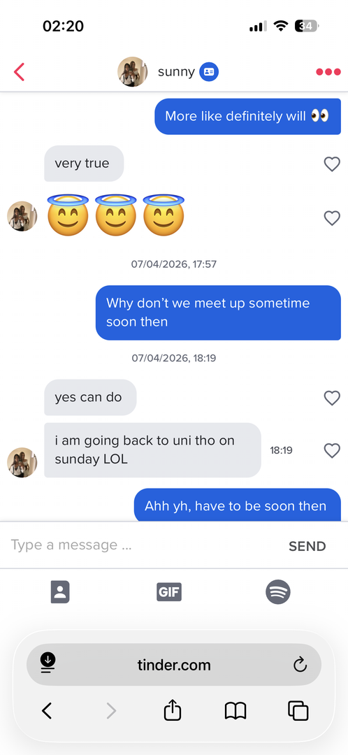 So matched with this girl. She’s in my town (1mile away) for the next few days then going back to uni so limited time.