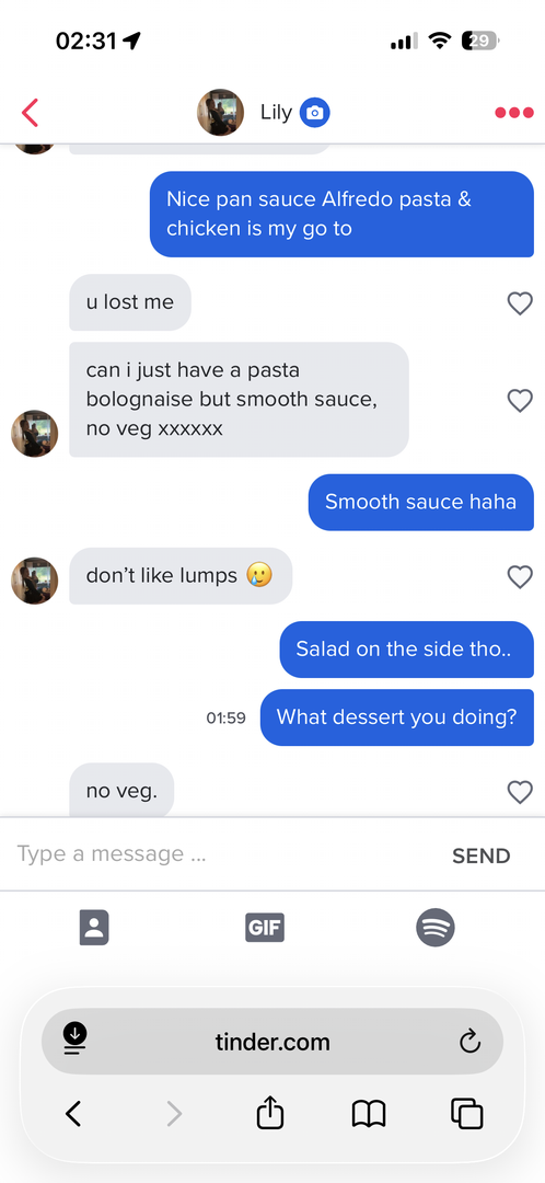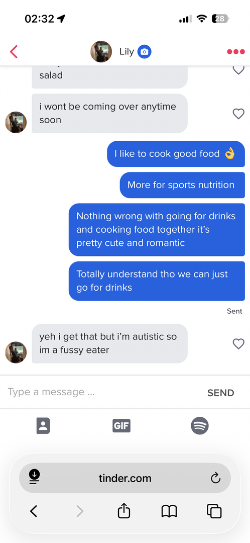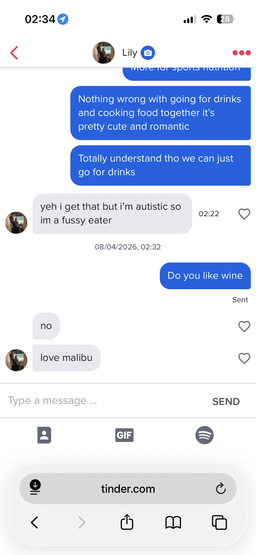But she was a fussy eater and it came awkward quick, then she said something about being autistic, not sure how to handle that, so I just said “do you like wine” and she said “no, love Malibu”