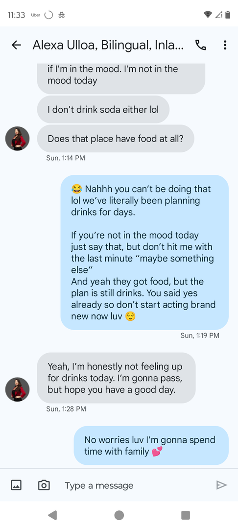 grab a margarita she agreed to it that was probably about a week ago maybe 6 7 days ago and now right before we're about to go meet up she's like I'm not in the mood to go