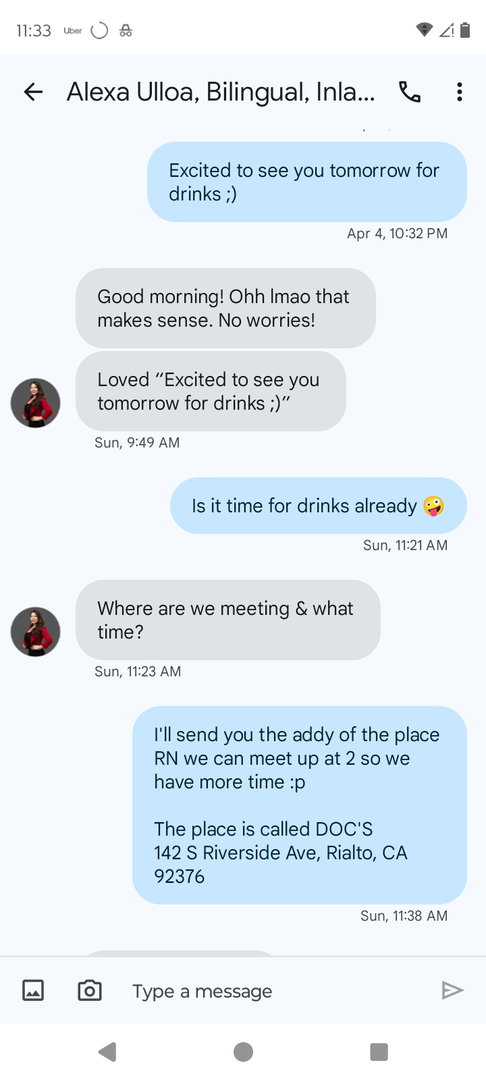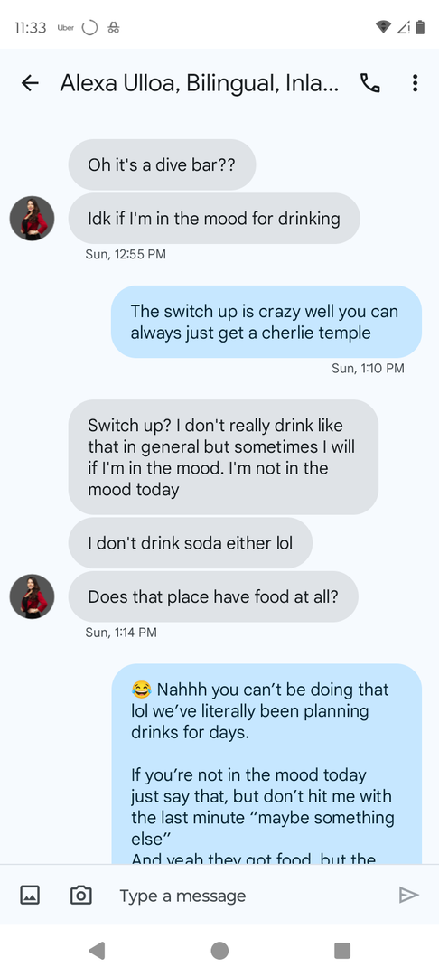 drinking and I told her how about you have a Shirley Temple which is just like a soda type of drink and then she's like asking oh do they serve food this and that and I kind of told her like yeah they serve food but I'm not switching up plans
